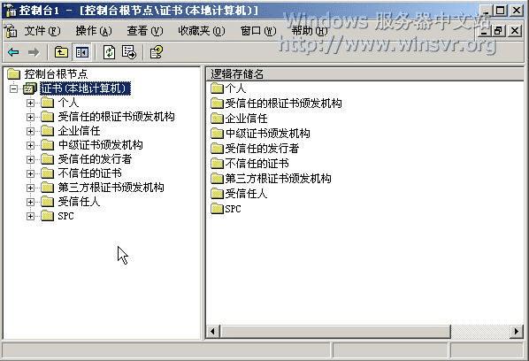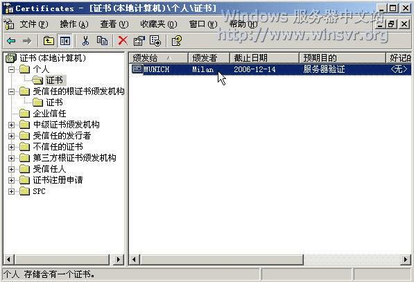 在计算机证书管理控制台中,展开个人下的证书,你可以看到刚才申请的服务器验证证书,
