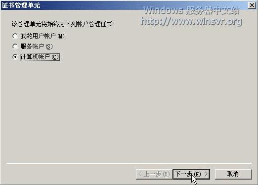 在证书管理单元对话框,选择计算机账户,点击下一步;