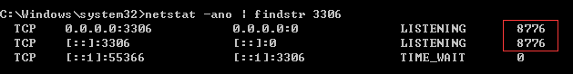netstat -ano | findstr 3306 可以查到该端口3306占用的进程PID号