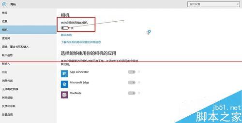 4、相机选项打开之后, 最上面有一个 允许应用使用我的相机, 下面是一个滑动条。左边是关闭,右边是打开