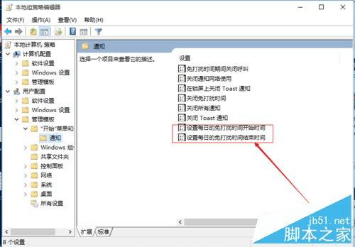3、点击选中【通知】,在右侧窗口,就可以看到“设置每日的免打扰时间开始时间”和“设置每日的免打扰时间结束时间”两个选项。