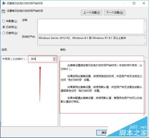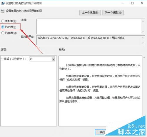 4、分别双击打开这两项的设置窗口,进行配置。先设置“设置每日的免打扰时间开始时间”点选“已启用”。
