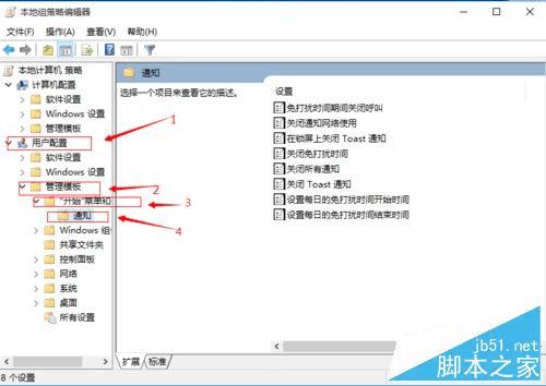 2、在打开的“本地策略编辑器”窗口中,依次点击展开左侧菜单中的【用户配置】--【管理模板】--【“开始”菜单和任务栏】--【通知】。