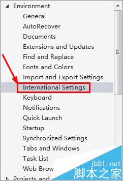 6、选择最左边的环境(environment)下的国际设置(international setting)。
