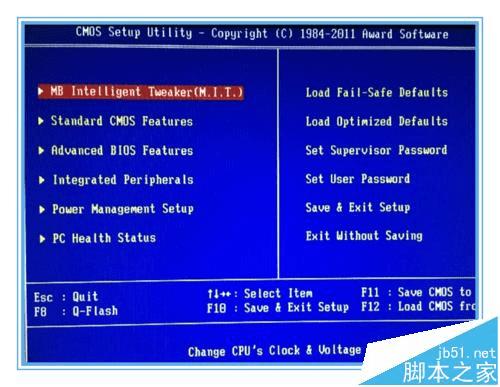 4、如下图,进入到MB inteligent tweaker; 用上下左右键选择,回车键进入,不同的BIOS界面有所不同,大部分配置都在左边的前三行,右边那些配置保存和导出的选项所有的主板都有,但暂时用不上,电源和状态管理也没用。