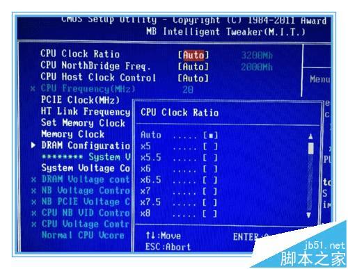 6、CPU clock ratio处配省为AUTO,回车后出来一堆数字,由小到大依次排列。下面来换算一下,外频是20MhZ,那缺省的320Mhz就是16倍,因此要超的话,要调得比16大,建议先不要超太多,10-15%即可。