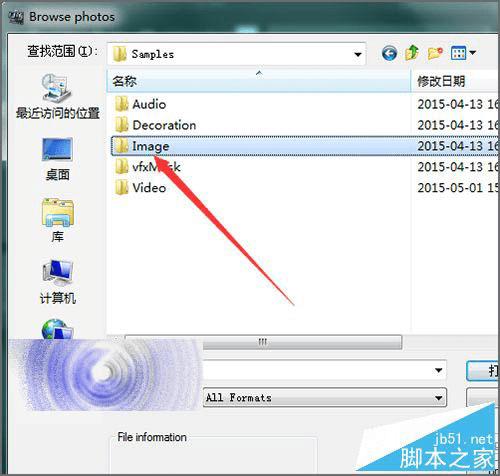 6、然后在它的列表中找到Samples的文件夹并打开。在它打开后弹出的界面列表中找到Image的文件夹。这个文件夹就是存放会声会影遮罩和图片的文件夹。