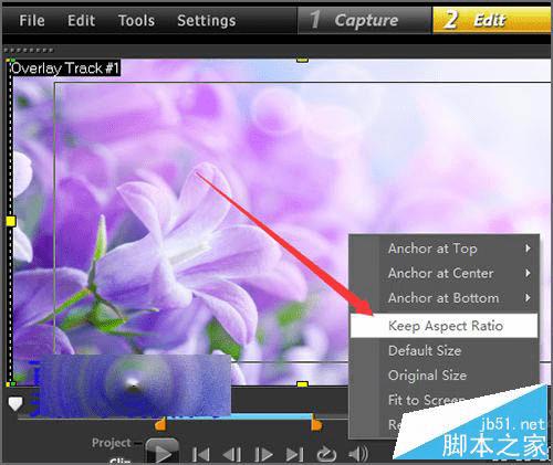 2、打开会会的软件,然后在覆叠轨上导入一张图片素材。然后选中图片,在它的上面点击右键适配到屏幕大小,接着再点击右键保持宽高比。准备好图片之后,接着点击界面右边的属性。