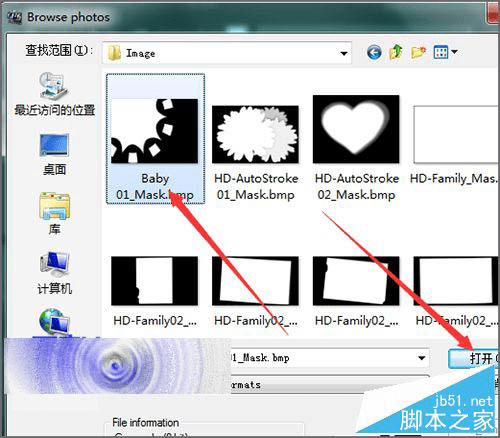 8、这个文件夹就是它的遮罩文件夹,找到了这个文件夹,我们就可以对它进行一些操作。在它的遮罩中就可以点击我们想要添加到软件界面中的遮罩。按状键盘上的ctrl键可以多个进行选择。选择好之后点击下面的打开。