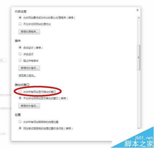 5、在“弹出式窗口”部分,选择“允许所有网站显示弹出式窗口”。