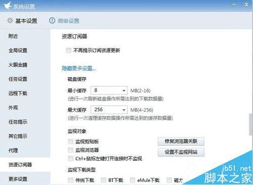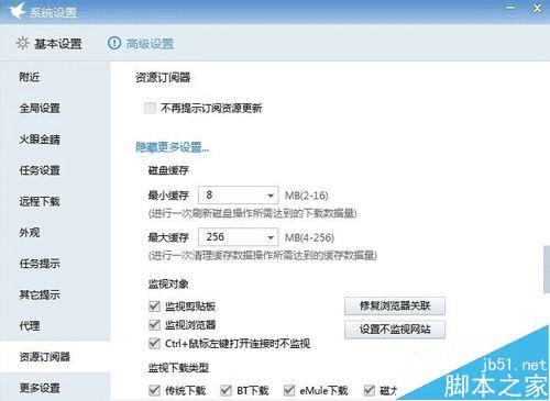 4、在资源订阅器中把“监视对象”和“监视下载类型”两个选项中的小勾勾都取消,然后关闭设置退出即可。