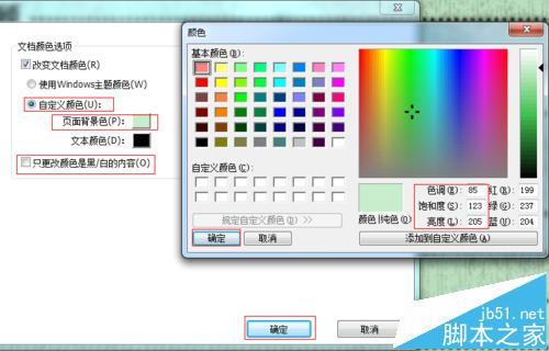 3、选择 '自定义颜色'->'页面背景颜色'->修改色调 85,饱和度 123, 亮度205 ->->不勾选'只更改颜色是黑白的内容'选项->确定保存