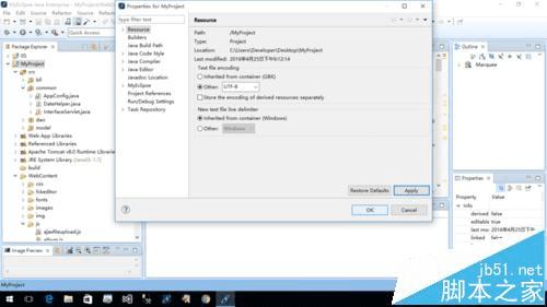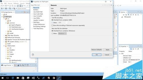 3、点击resource,在text file encoding中,默认选择inherited from container(GBK)