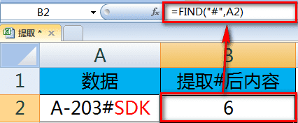 2、首先,在B2中输入公式:=FIND("#",A2),返回#在字符串中的位置,#在A2单元格文本中是第6个字符。