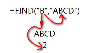 3、知识点说明:FIND()函数查找第一参数在第二参数中的位置。如下图,查找“B”在“ABCD”中是第几个字符。第一参数是要查找的字符“B”,第二参数是被查找的字符串。最终返回“B”在“ABCD”中是第2个字符。