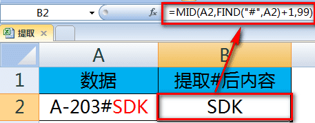 1、如下图,要提取#后面的字符,也即红色的“SDK”到B列。