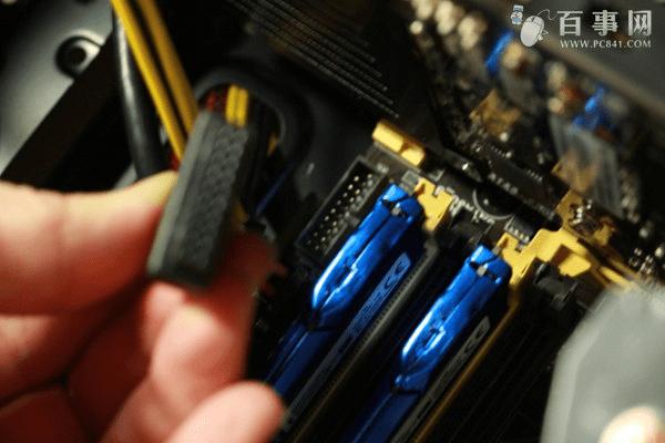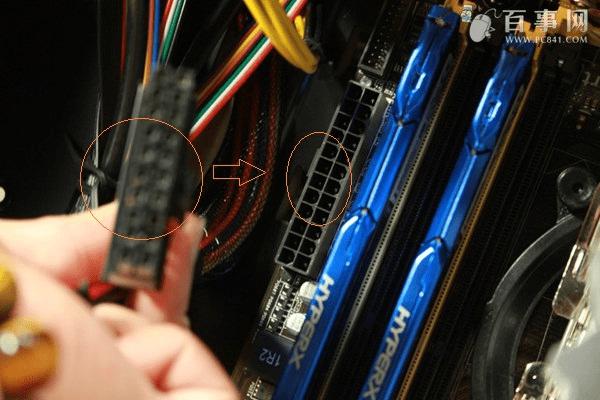 然后再进行主板供电连接,首先找到电源接口中24Pin接口,这个是电源中最大的一个,而且主板电源线的接头是两个:一个大的很长,一个短的较小,对应的主板插槽孔位也是这样的设计,这两个接头要并排紧挨着插上去才行。将这两个是供电插头插入主板内存条附件的主板供电插槽即可。