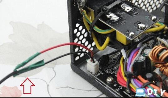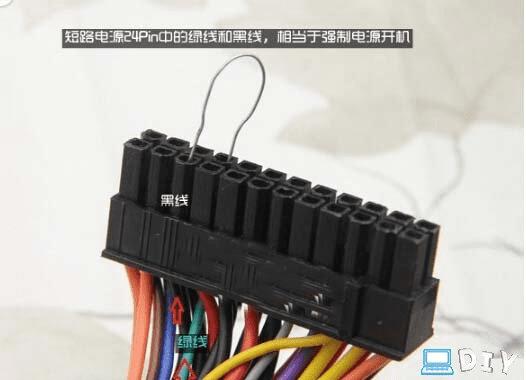 2、然后使用一根小铁丝,将电源24Pin接口中的绿线对应接口与黑色对应接口短路连接(相当于电脑开机操作),然后电源风扇正常旋转,则说明风扇更换成功,如果风扇不转,先断开交流电源,然后检查一下风扇电源接口处是不是插反了,一般只要电源没坏,风扇没坏,正常将黑线与绿线端口短路,电源就相当于正常工作,风扇就会正常旋转。