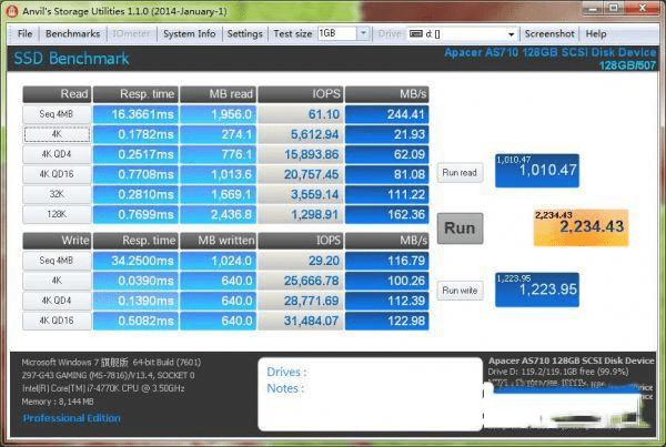本次实测使用的是宇瞻AS710 128G SSD,这款产品使用的是SandForce SF-2241VB2主控芯片,Apacer闪存,128G的容量,有四个闪存颗粒。这款产品拥有二个接口,既可以通过SATA3(6Gbps)接口当SSD硬盘,又可以通过USB接口当USB3.0移动硬盘。此次测试使用的是SATA3(6Gbps)接口。