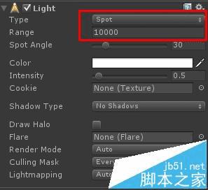 2、本文创建了一个平行光源。前面也说过,unity3d可以创建4种类型光源。在检视面板,点击红框的选项,可以任意换光源类型。