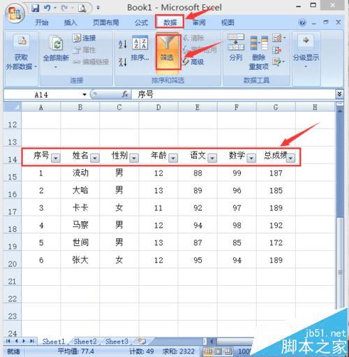 1、打开excel,找到自己的工作表内容。选择表格内容,点击“数据”,选择“筛选”,表格的标题行都会有小三角出现。