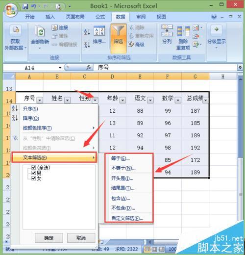 法二:点击“性别'旁边的小三角,选择“文本筛选”,选择“等于”,按自己的筛选条件进行设置即可。
