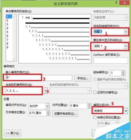 按照下图中所示的顺序设置编号格式,可以在标号1处,选择不同的标题,对应于左侧不同的级别,将所有的级别都进行类似的修改,以方便以后的使用: