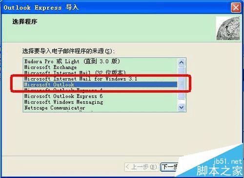 2、在“Outlook Express”中,点击功能菜单条中的“文件”->“导入”->“邮件”,弹出邮件导入向导页面,选择“Microsoft Outlook”,点击“下一步”。