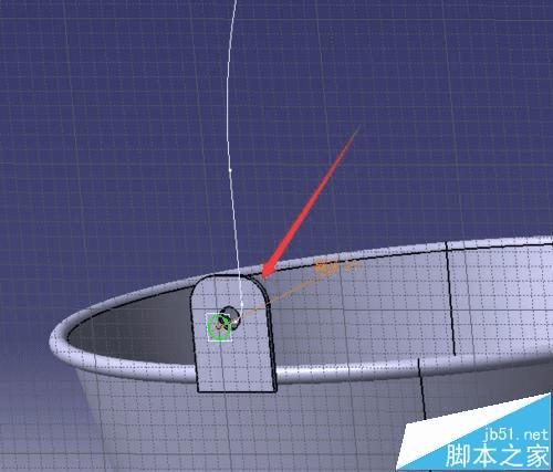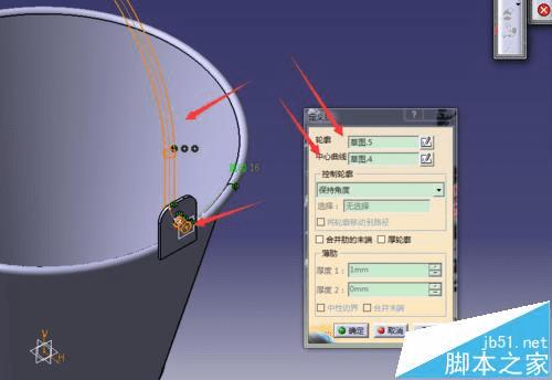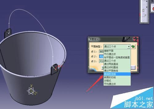 5、绘制水桶梁。用到肋的命令;选择YZ平面,进入草图,选择轮廓绘制一条图示曲线,突出草图,一绘制的曲线一端的点创建一个平面,选择曲线的法线。
