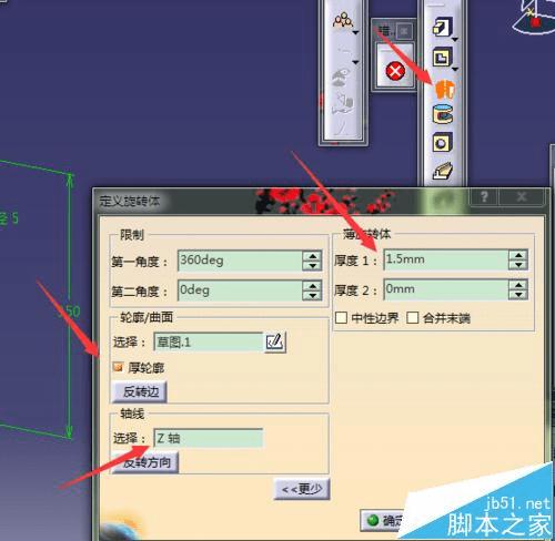 3、把轮廓线进行约束;退出草图,选择旋转,旋转轴为Z轴,厚度1为1.5mm.确认。