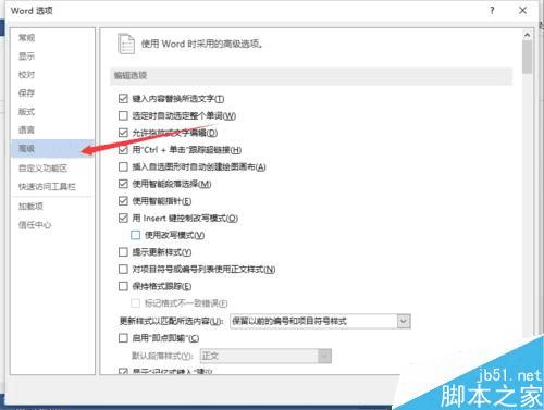 五、在弹出的“Word选项”对话框中,选择并点击“高级”选项卡栏。如图所示;