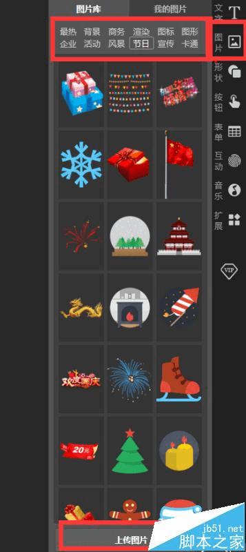 3。例如,你想要添加一些照片祝福类的小图片可以点击图片然后按照类型选择,婚礼是在节日里找,又或者你要添加本地照片就点击下方红框里的上传照片就可以了,编辑完以后你就可以选择保存或者发布分享给想要看的人了~