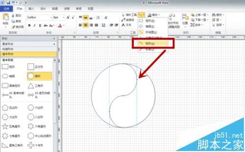 3、用上方“弧线”绘制工具从正圆顶端开始分四次绘制出八卦中心的“S”线。