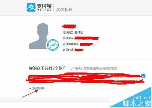 6、到了最后一步了,我们点击如图中所示的”添加账户“,就可以实现一个身份证关联几个支付宝账号了
