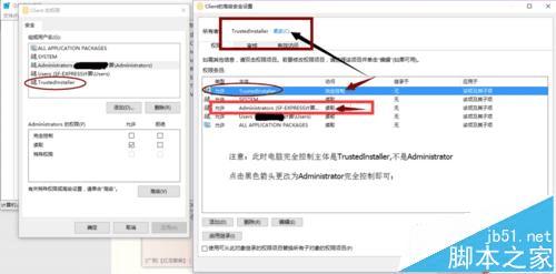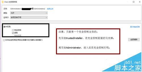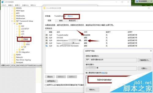 4、此Administrator管理员帐户只有只读权限,没有完全控制权限,是无法对注册表更改的,所以,这时点‘高级’在弹出的窗口上部,可以看到所有者是trustedinstaller,所以必须要将其改成administrators.点右边的更改,在弹出的窗口中输入administrators点确定再看所有者就成了administrators了,返回权限窗口选择administrators 勾上完全控制 ,这时点应用就可成功获得完全控制权。