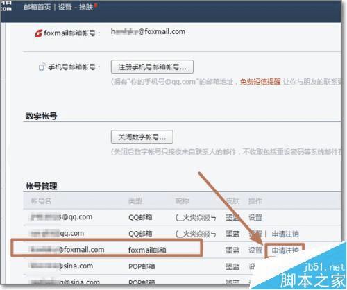 3、往下拉,找到邮箱账号管理,foxmail.com域名后缀的邮箱账号后面,点击申请注销。