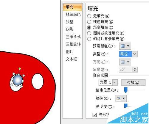 7、再次使用椭圆形状,画出两个较小的椭圆,填充色选渐变,在其他渐变里类型选为路径。