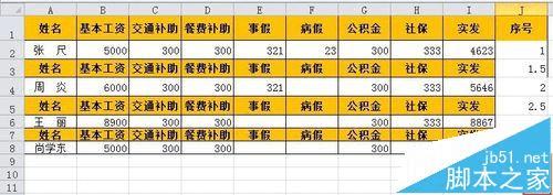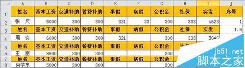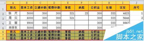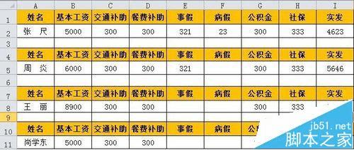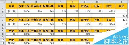 7、在每个员工之间就有一空行了,这样我们在裁剪工资条时,就轻松多了,