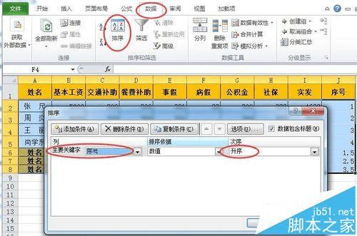 6、光标定在数据表中,再点“数据”排序,主要关键字选择“序号”。单击确认按钮。