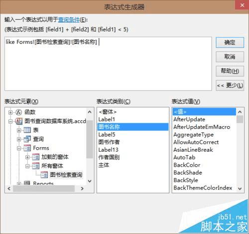5、输入like,找到“表达式元素”>“Forms”>所有窗体>窗体名称。再在“表达式类别”栏中选择图书名称。