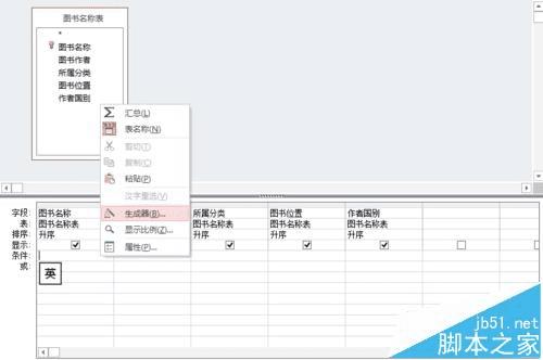 4、在“图书名称”条件一格中右击,选择“生成器”。