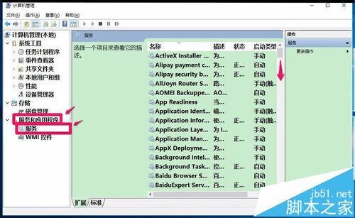 2、在打开的计算机管理窗口,点击窗口左侧的“服务和应用程序”- 服务,在服务对应的右侧窗口,按住小滑块向下拖动;