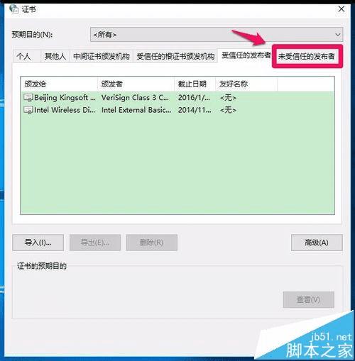 3、在“证书”窗口,我们点击:未受信任的发布者;