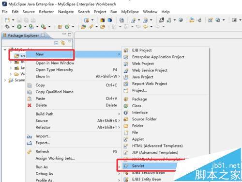 1、展开项目,选中“src”目录,右键选择“New”进入下级选项卡,选择“Servlet”