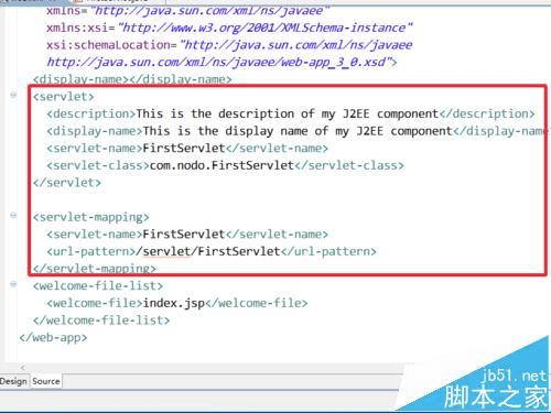 4、打开“FirstServlet”查看代码中各方法的书写,以及打开“web.xml”配置文件,查看是否成功配置。