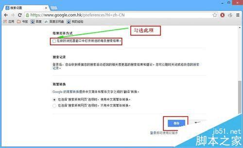9、向下滚动窗口,找到“结果打开方法”,勾选“在新的浏览器窗口中打开所选的每条搜索结果”,点击“保存”按钮,如下图所示: