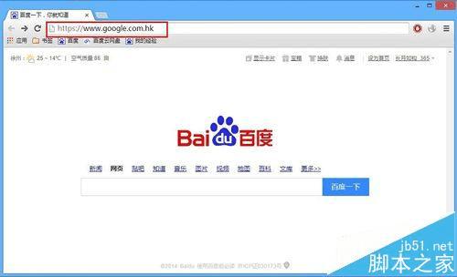 2、在地址栏中输入“www.google.com",如果没有翻墙,此网址会默认重定向到“www.google.com.hk”,由于重定向会花费一些时间,所以我们直接在地址栏输入“www.google.com.hk”网址后回车,快速打开网站,如下图所示: