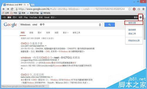 8、在搜索结果页中,点击齿轮状的图标“设置”,再选择“搜索设置”,如下图所示: