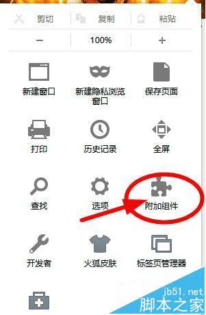 1、点击浏览器右上方的打开菜单,点击打开菜单后,在出现的对话框中点击附加组件
