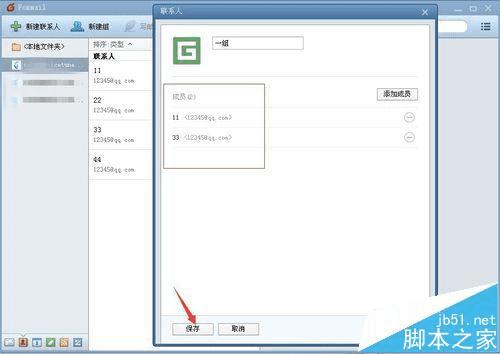4、联系人添加完成后,即可以看到改组列表中所有联系人信息。发现有误添加进来的或者是漏加的,此时可以点击右边的“添加成员”按钮来进行修改。确认无误后,点击“保存”按钮。保存后有需要修改依然可以点击编辑按钮来修改。